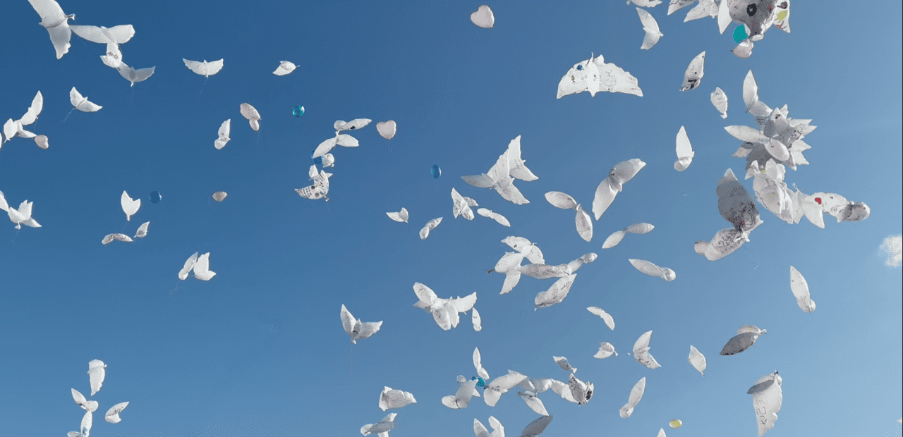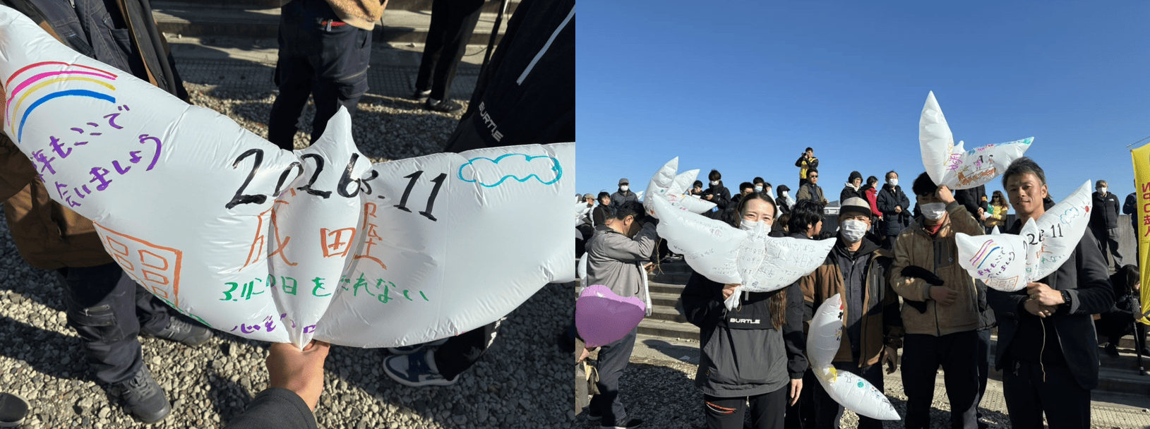 メッセージを込めたハト風船を、祈りとともに空へ送りました。